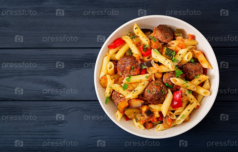 Паста с фрикадельками в томатном соусе и овощами в миске