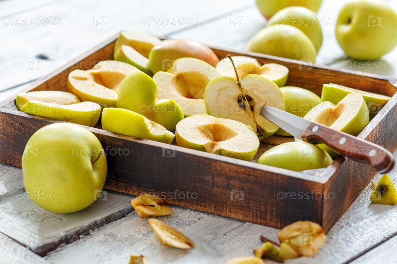 Нарезанные зеленые яблоки в деревянном ящике