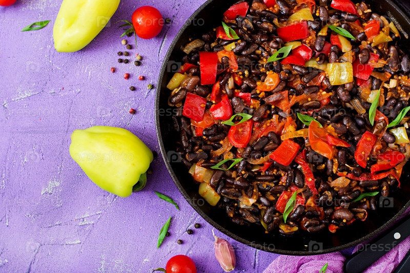 Тушеные черные бобы со сладким перцем и помидорами с острым соусом