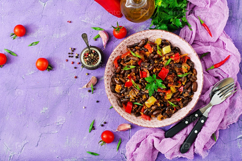 Тушеная черные бобы с перцем и помидорами с острым соусом в розовой чаше