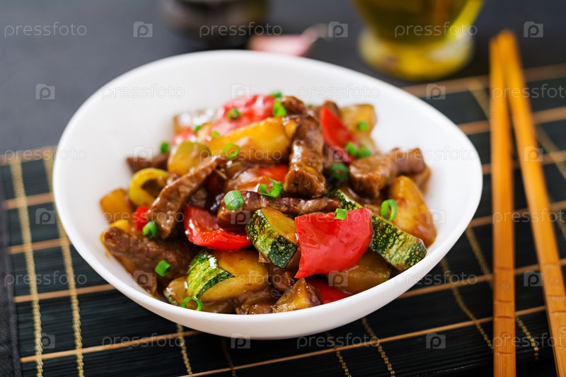 Жаркое из говядины со сладким перцем, кабачками и зелеными яблоками