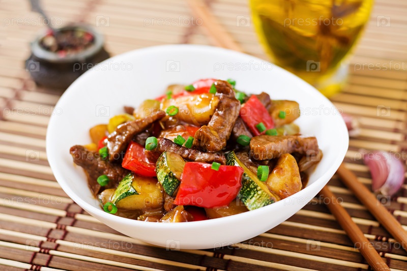 Жаркое из говядины со сладким перцем, кабачками и зелеными яблоками