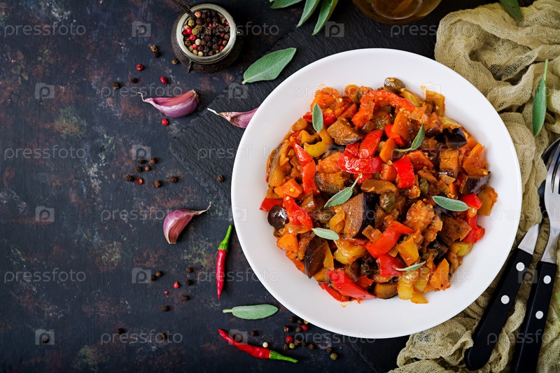 Горячие пряные тушеные баклажаны, сладкий перец, помидоры и каперсы