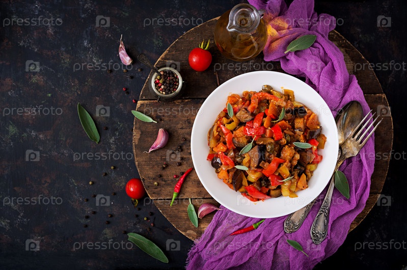 Горячие пряные тушеные баклажаны, сладкий перец, помидоры и каперсы