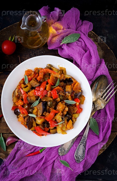 Горячие пряные тушеные баклажаны, сладкий перец, помидоры и каперсы