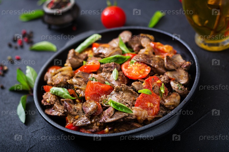 Куриная печень с луком и помидорами в сковороде