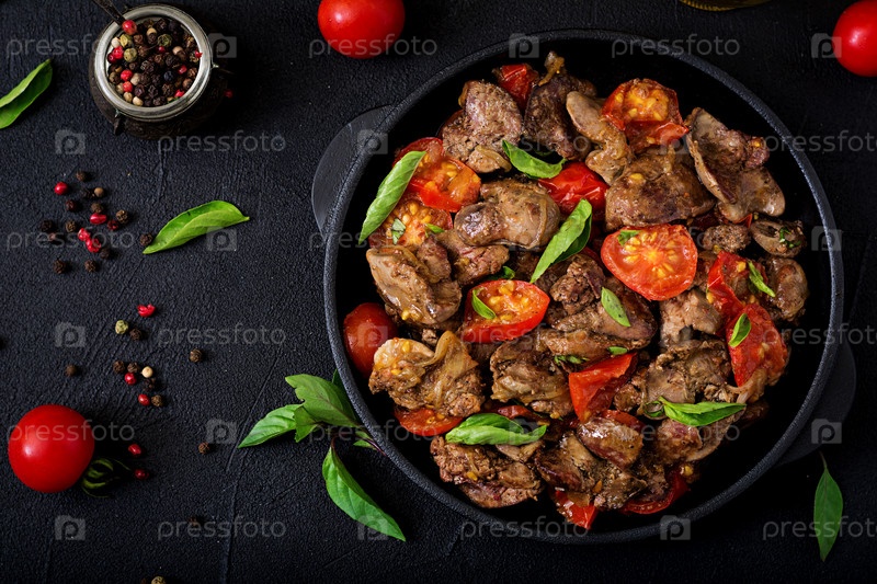 Куриная печень с луком и помидорами в сковороде