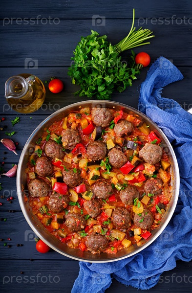 Тефтели в томатном соусе и овощи в сотейнике