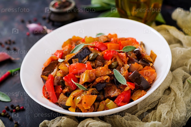Горячие пряные тушеные баклажаны, сладкий перец, помидоры и каперсы