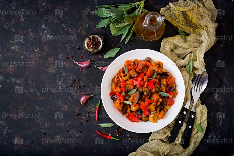 Горячие пряные тушеные баклажаны, сладкий перец, помидоры и каперсы
