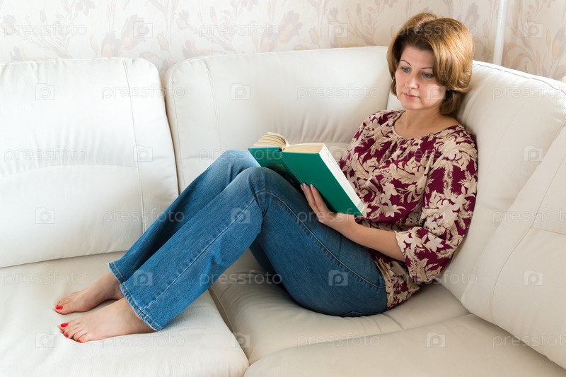 Женщина с книгой, сидя на диване в комнате