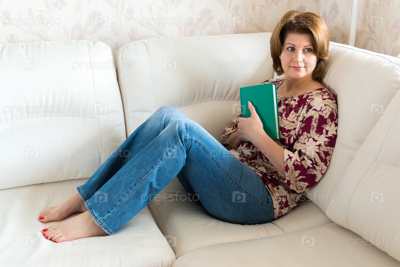 Женщина с книгой, сидя на диване в комнате