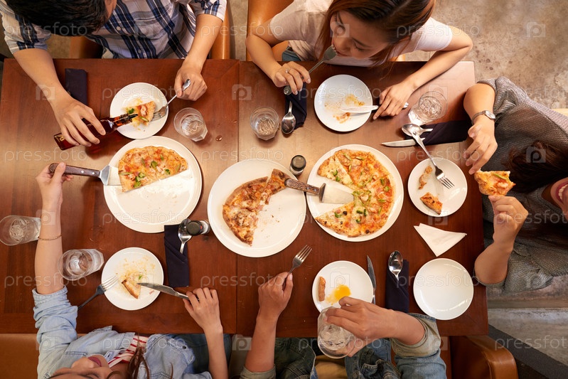 Молодые люди едят пиццу