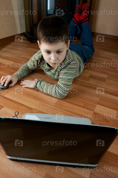 Мальчик лежит на полу с ноутбуком