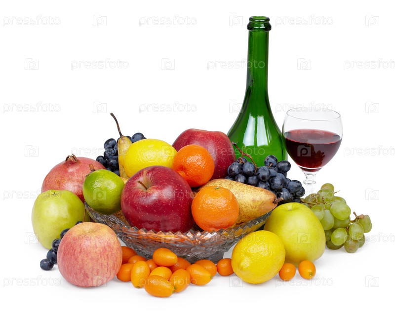Различные фрукты и красное вино на белом