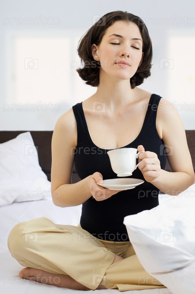 Девушка наслаждается своим кофе в постели