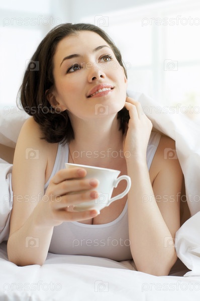 Девушка наслаждается своим кофе в постели