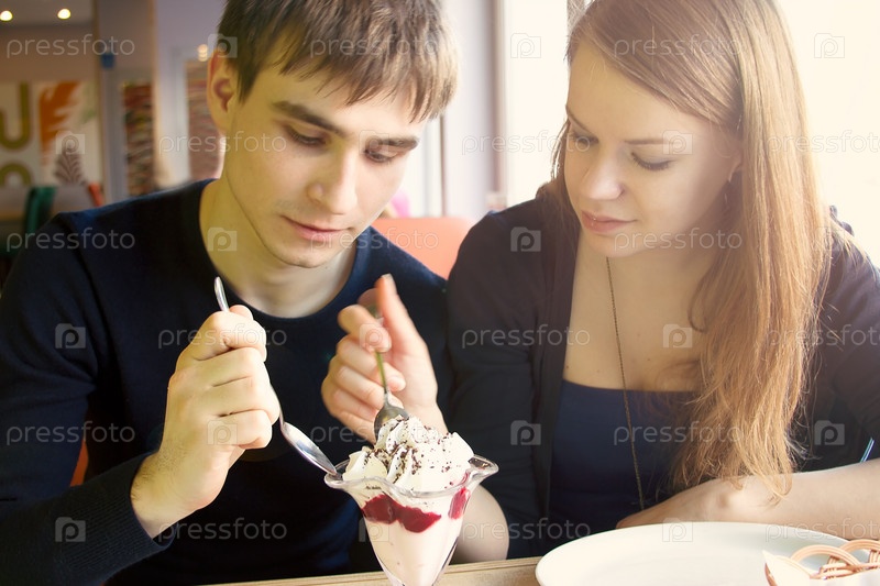 Милая молодая пара ест мороженое в кафе