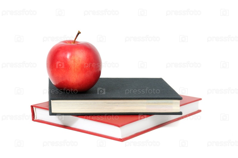 Красное яблоко на книгах, изолированных на белом