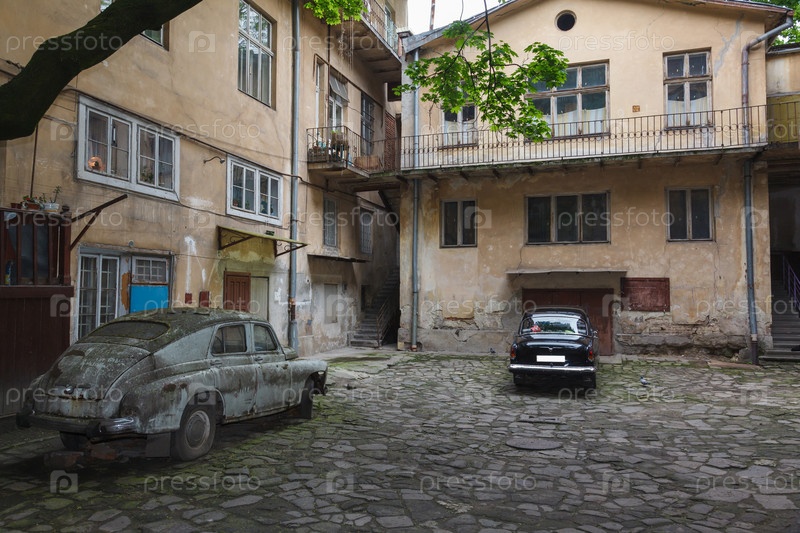Винтажный и старинный автомобили в старом дворике Львова