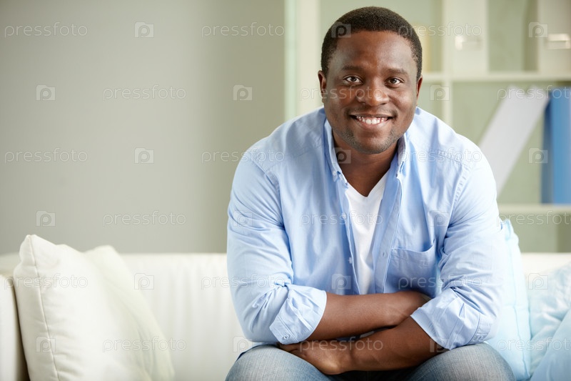 Молодой темнокожий мужчина сидит на диване