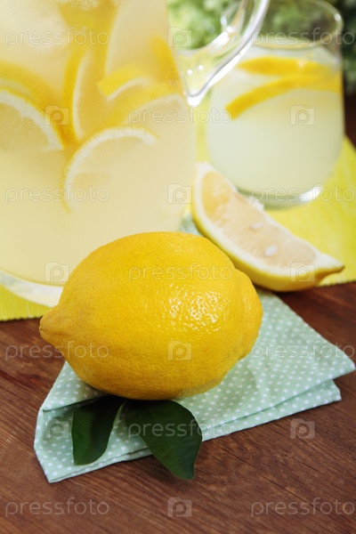 Лимон, кувшин и стакан со свежим лимонадом на столе