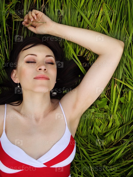 Портрет молодой брюнетки, лежащей на зеленой траве