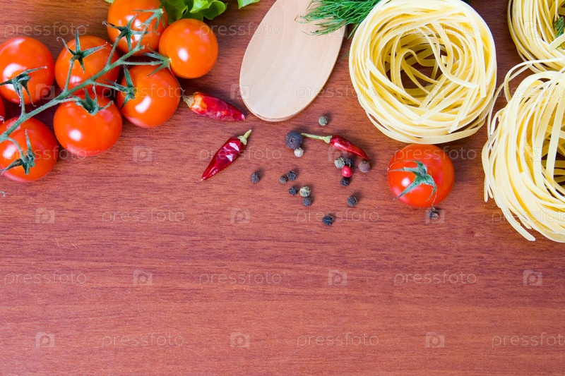 Паста и свежие овощи на деревянном столе