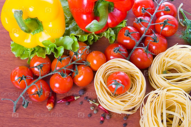 Паста и свежие овощи на деревянном столе