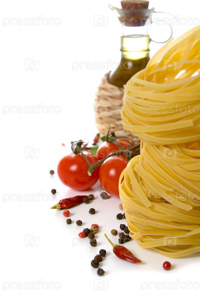 Паста и свежие овощи, изолировано на белом фоне