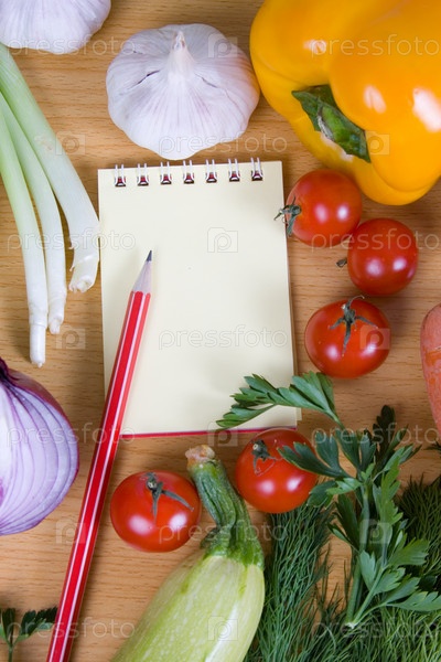 Свежие овощи и блокнот с карандашом на деревянном столе