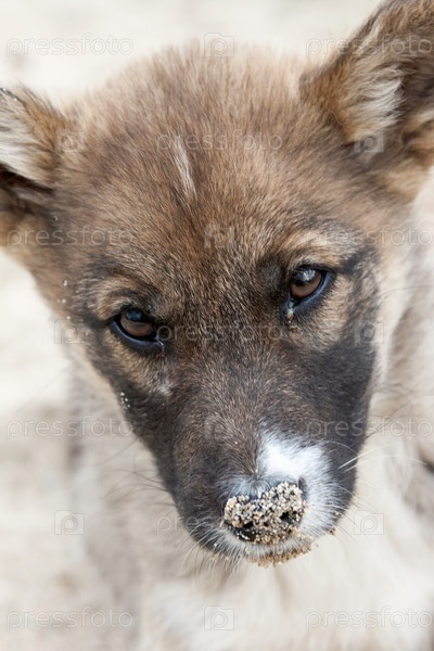 Морда щенка с носом в песке