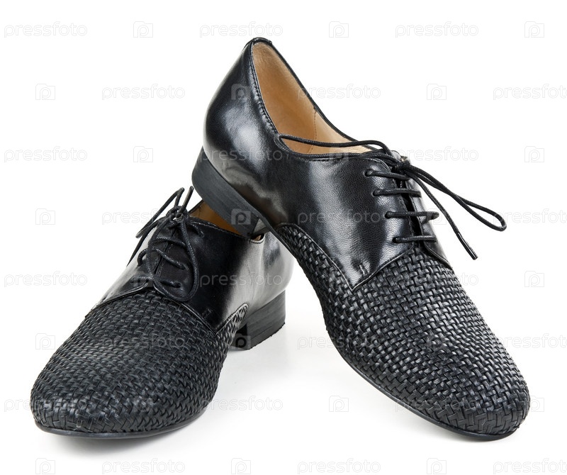 Стильные черные кожаные туфли на белом фоне