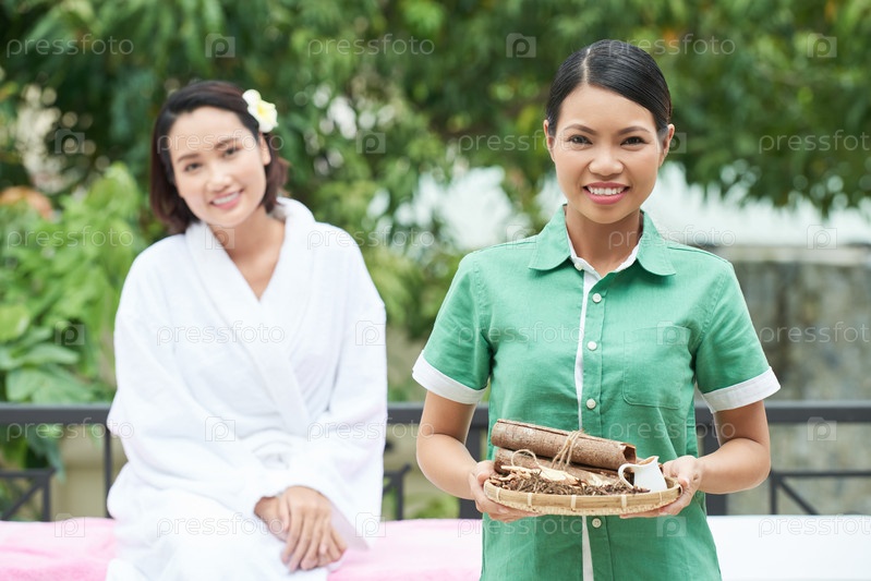 Профессиональный косметолог держит поднос с травами для спа-процедуры