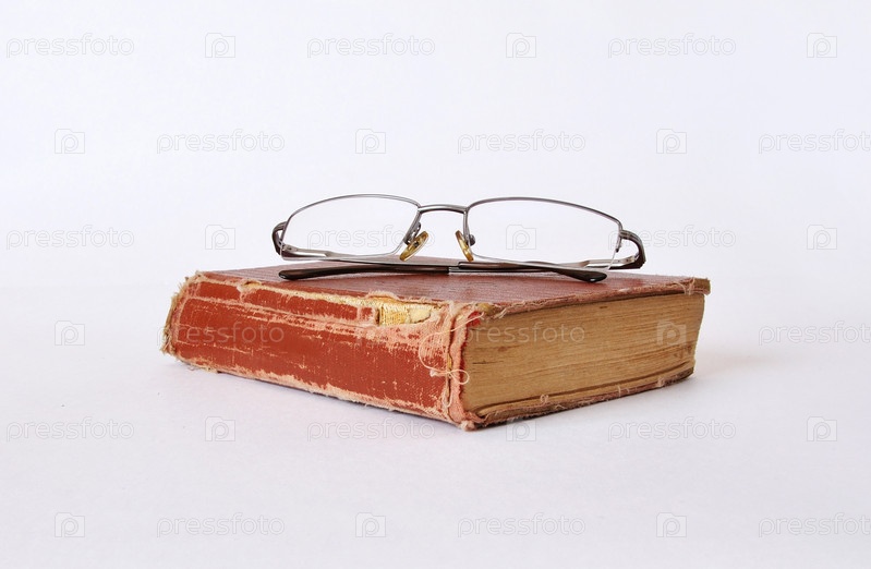 Старая красная книга и очки, изолированные на белом фоне