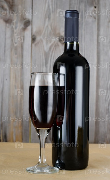 Бутылка и бокал красного вина на деревянном столе