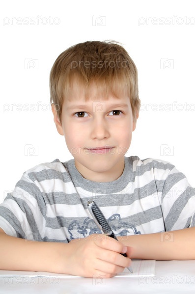 Мальчик пишет в тетради ручкой, белый фон