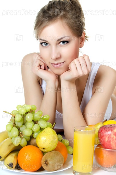 Красивая девушка с фруктами и соком на белом фоне