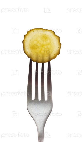Ломтик зеленого маринованного огурца на вилке