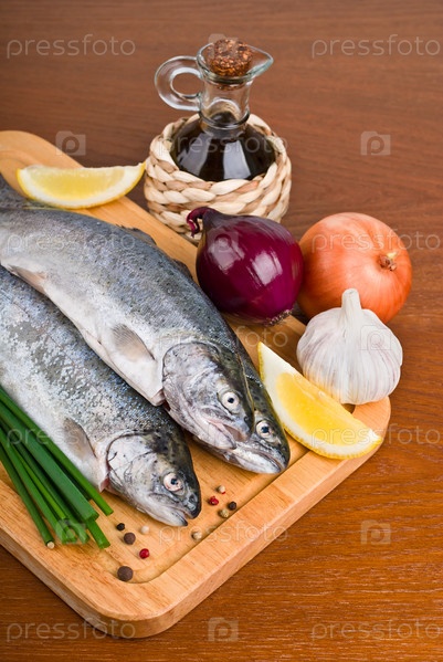 Свежая рыба с перцем, луком и лимоном на деревянной доске