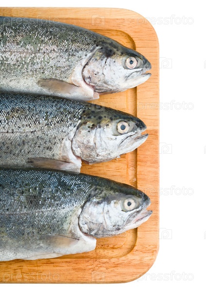 Форель на деревянной доске, изолировано на белом фоне