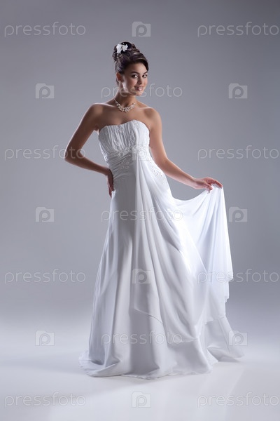 Молодая красивая темноволосая женщина в модном подвенечном платье