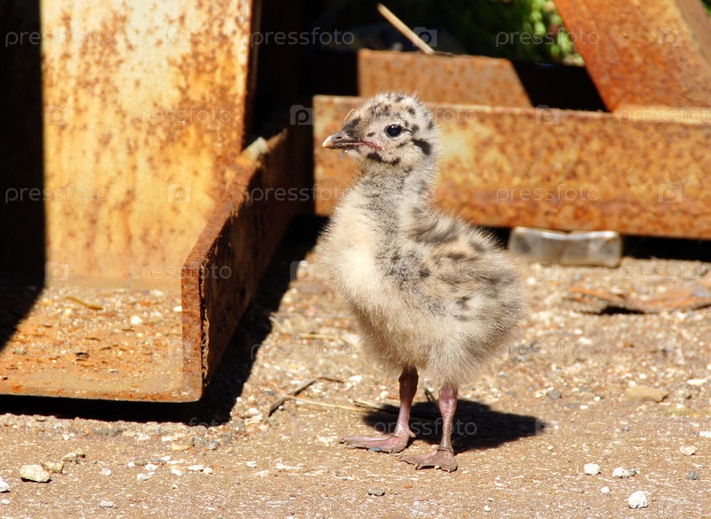 Птенец чайки стоит на земле