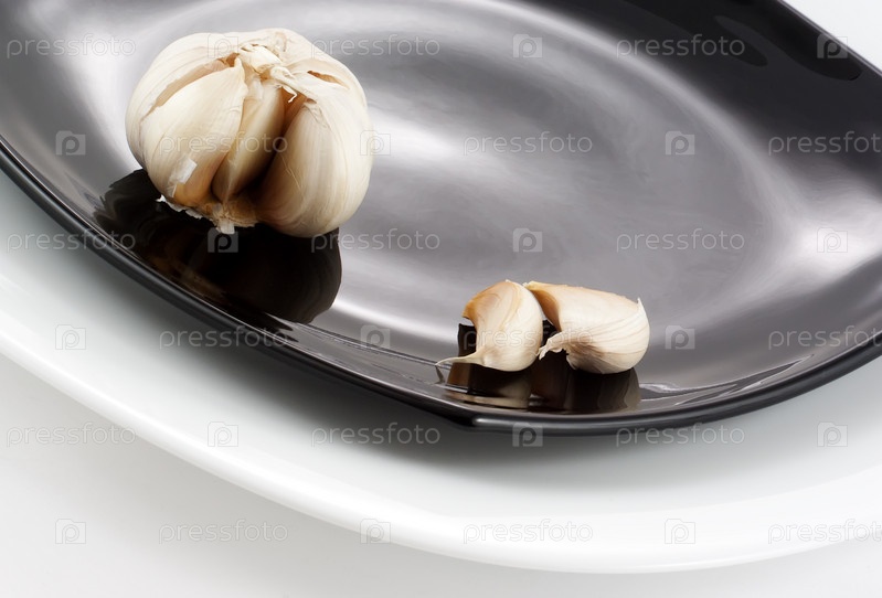 Головка чеснока на темной тарелке