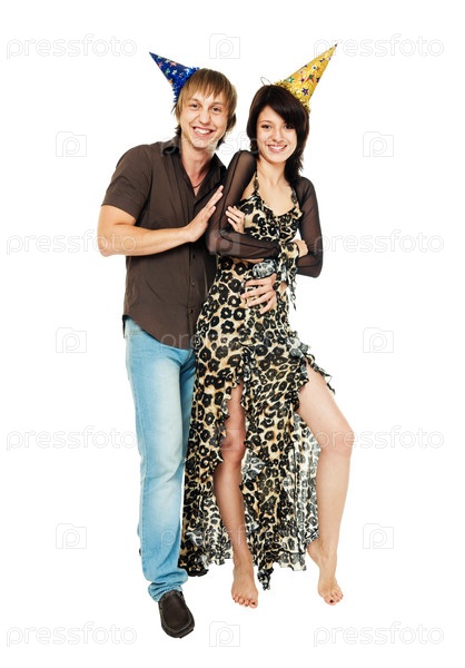 Молодая красивая пара в колпаках, изолированные на белом фоне