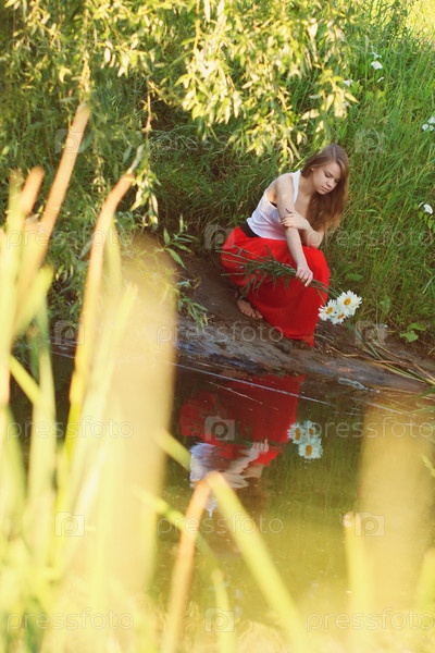 Красивая девушка с букетом ромашек на озере