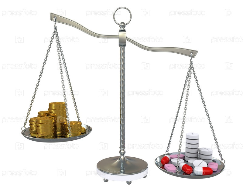 Деньги и таблетки на золотых весах. Изолировано на белом фоне