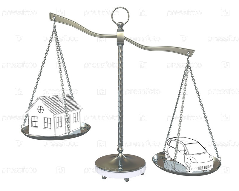 Эскиз дома и автомобиля на весах. Изолировано на белом фоне