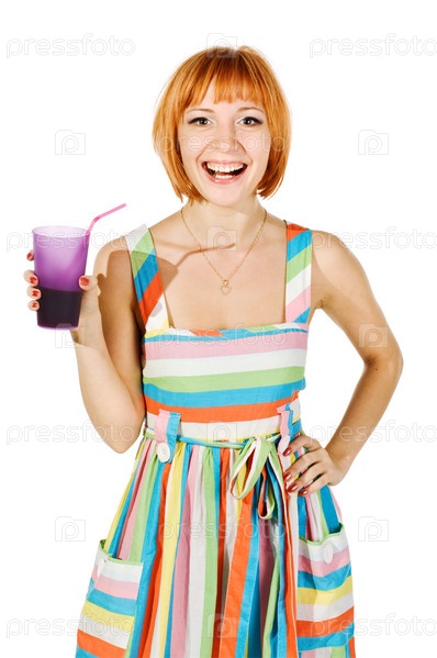 Красивая девушка со стаканом содовой воды, изолированная на белом фоне