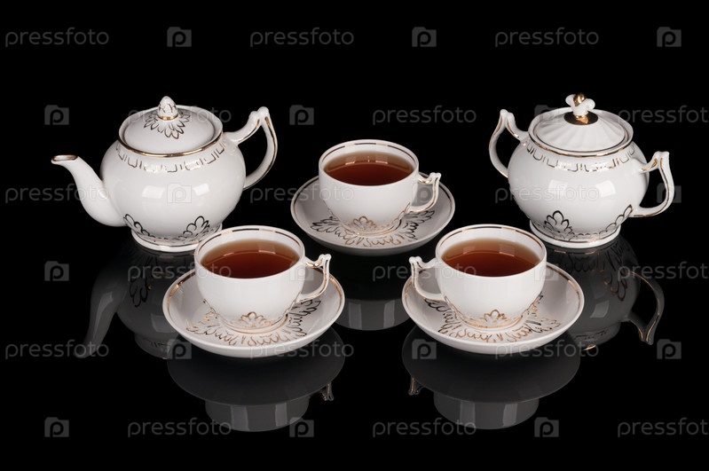 Белый фарфоровый чайный сервиз на черном фоне